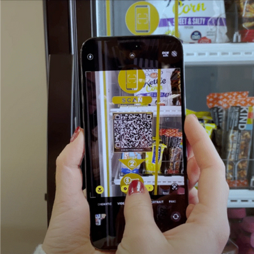Our machines are unlocked using any smartphone with a camera. Simply scan the QR code on the door, set up your payment method, and the door unlocks for you to find your favorite snack.